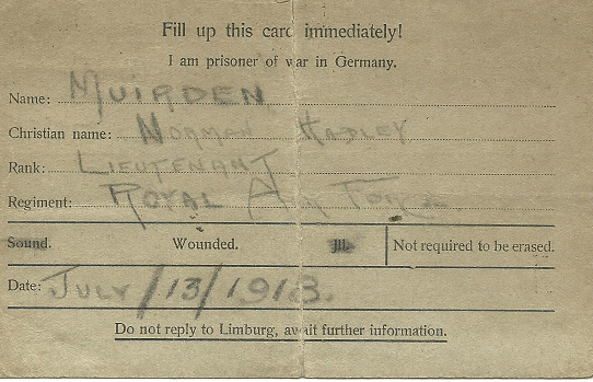 I was named Norman after my mother’s uncle – Norman Hadley Muirden. He saved my mother when they were torpedoed off Milford Haven during the First Word War and died in Germany. What a surprise finding this card among some of my mother’s paperwork during 2023 – 105 years after Norman was shot down over Germany; and what a trauma having to fill in such a card as a PoW and for the recipient (in this case his mother in Aberdeen). Sylvia Jobson acquired copies of Norman’s record cards from the RAF Museum – the one for next of kin listed Mrs M Muirden, Heathfield, Cunningham Place, Inverurie, Aberdeen. Under her name was written ‘Letter d 11/3/20 Pers file C87771’ – address and letter date are different from the card below. However, I do remember my mother talking about holidays in Inverurie.